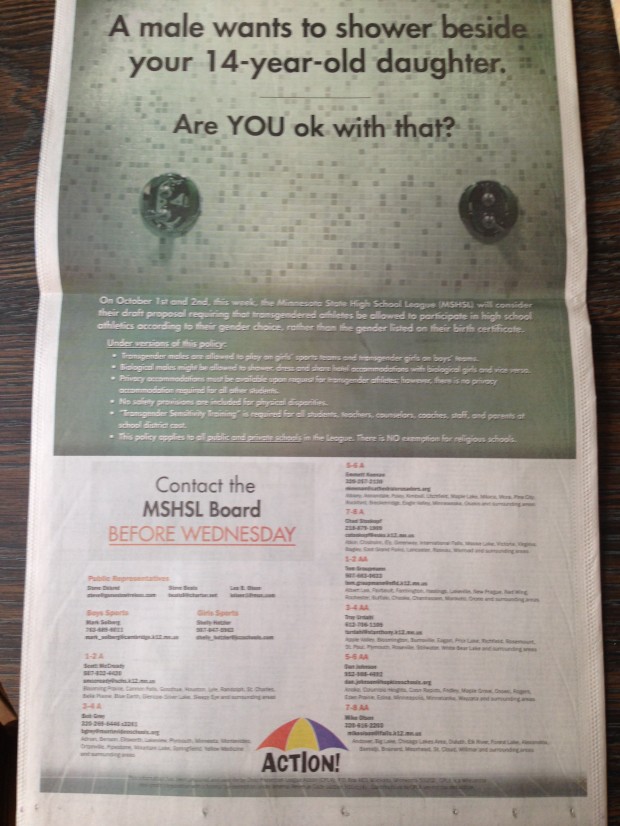 The Child Protection League, the group that fought anti-bullying measures and GLBT protections in schools, has taken out a full-page ad below in the Star Tribune. The MSHSL needs to hear from those of us who support this measure. If you are local, would you email the board to voice your support?