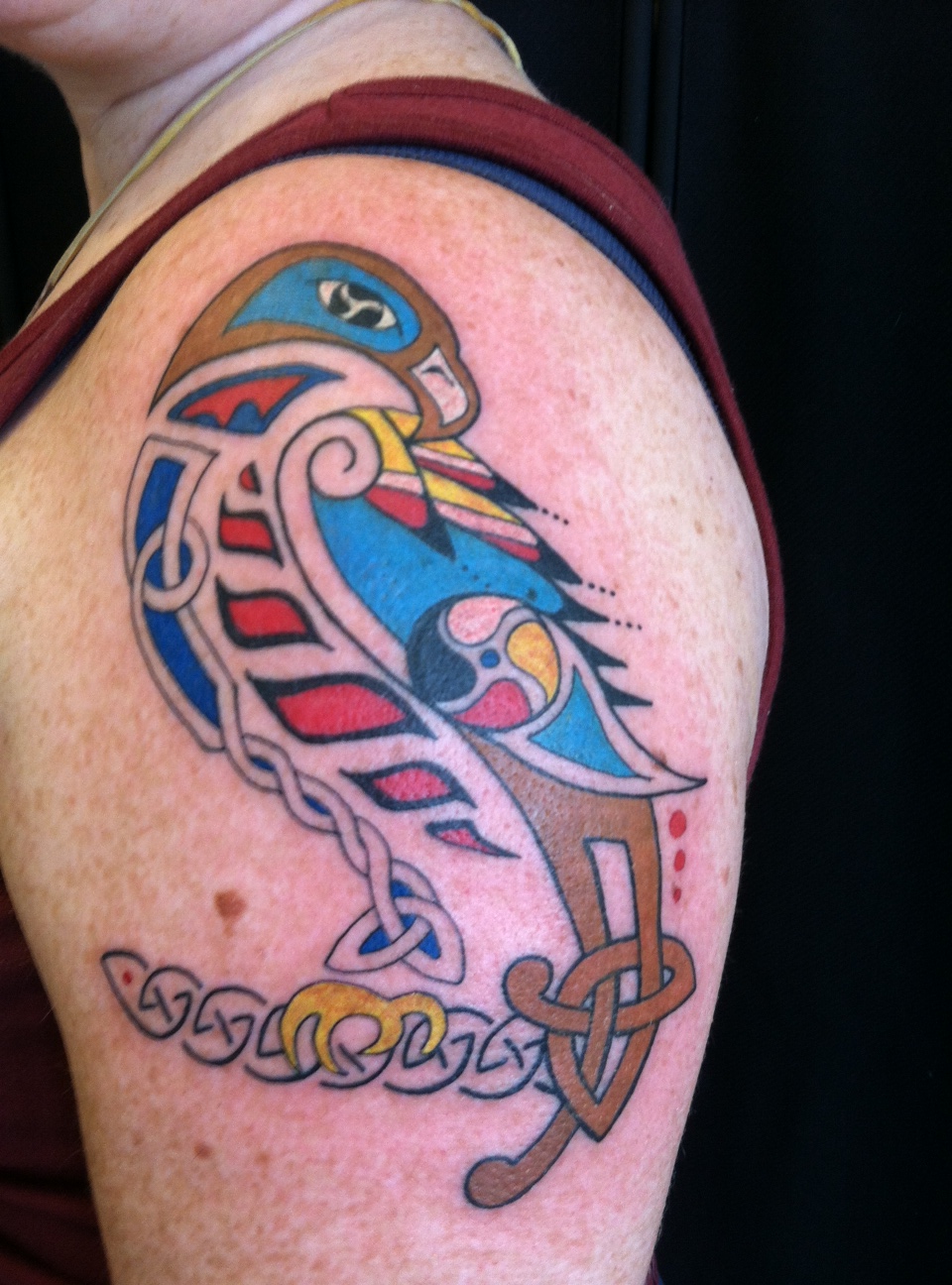 This tattoo is for him, and for that hawk. It is a combination of Irish influences (specifically, the Book of Kells) and modern Mohican artwork. I also incorporated a Celticized version of the medicine wheel Danny used when helping people who were sick or lost in his role as a Pipe Bearer: the colors of the four directions that mattered to him, but in a modified quadruple-spiral (rather than the triple spiral in most Irish art).