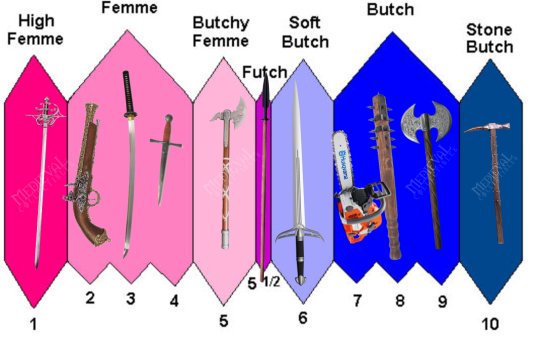 I went to look at the tweet, which was a list of lesbian categories from high femme to stone butch with our accompanying weapons of choice: