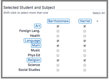 Tip: We know that homeschoolers often have lessons and courses combining multiple areas of study. You may select multiple students and courses by pressing the SHIFT key when selecting a checkbox. You may select all students and courses by clicking on ‘Select All.’
