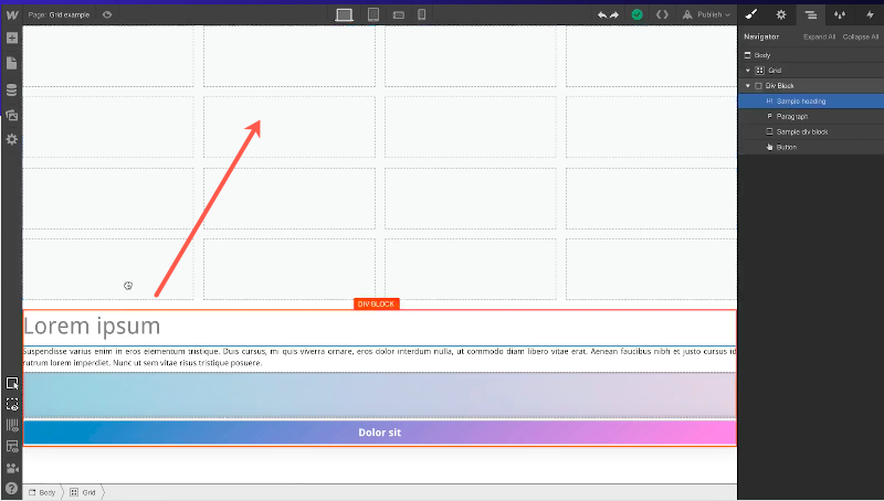 Guess what else is content? Div blocks. That means you can combine the strengths of Flexbox with Grid. Just drag a div block into your grid (or a grid inside of a div block).